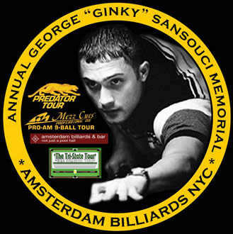 2nd Annual George "Ginky" SanSouci Memorial TournamentEXTREMELY IMPORTANT: The only way to guarantee your spot is to pay your entry. Any entry unpaid by August 23 will be replaced by any players on the alternate list who have paid. This historic event will take place at Amsterdam Billiards & Bar on September 1st, 2nd, and 3rd 2012. Please be advised that this event, which honors NYC's Champion, will be limited to 128 ABCD Players and 32 Open/Pros, due to the expected size of the field as well as table availability. This is a $4,000 added event and will be played over 3 days during Labor Day weekend (September 1-3) at the Amsterdam Billiard Club. As this is a collaboration of the Tri-State, Mezz & Predator Pro/Am Tour, the entries fee are an additional $10 above the normal entry fee. We will be doing the draw for the tournament on Thursday, August 30th at 9pm at the Amsterdam Billiard Club! Feel free to come down and watch and even pick your own number! Please visit the Predator Pro/Am Tour site for more information. The following Open/Pro players are confirmed to attend the Ginky memorial: